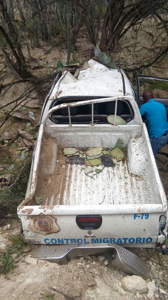 Duvergé.- Este accidente acaba de ocurrir en la carretera de El Limón a Las Baitoas. Son agentes de Control Migratorio (COMI), quienes tienen la tarea de recoger a todos haitianos indocumentados que deambulan en nuestro país.