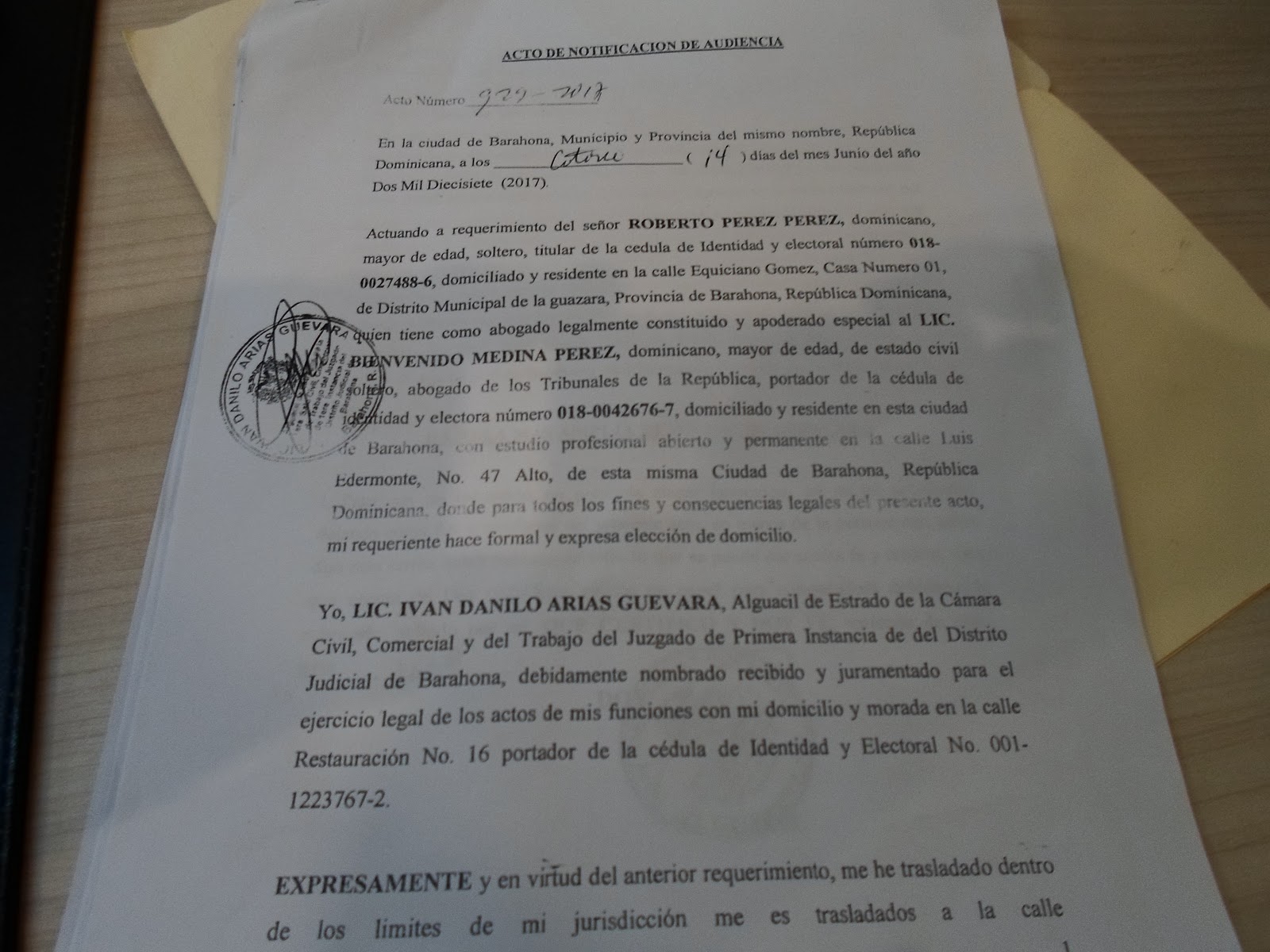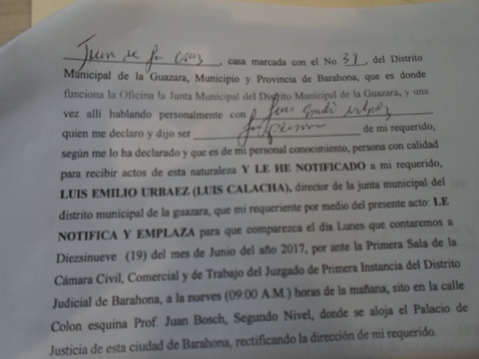 El señor Luis Emilio Urbáez (Luis Calacha), director de la Junta Municipal del distrito municipal de La Guázara, ha sido emplazado a comparecer el próximo lunes 19 de junio de este 2017, a las 9:00 de la mañana, ante el juez presidente de la Primera Sala de la Cámara Civil, Comercial y de Trabajo del Juzgado de Primera Instancia del Distrito Judicial de Barahona.