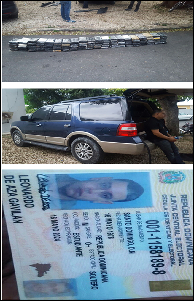 El detenido fue identificado como Leonardo De Aza Gavilán de 38 años de edad y residente en la ciudad de Santo Domingo quien fue detenido abordo de la jeepeta marca Ford Explore color azul placa G362123, donde transportaba la presunta cocaína.