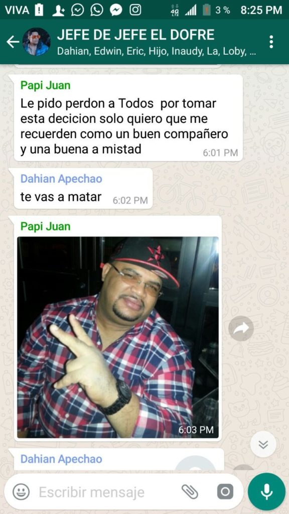 Consultado al respecto el merenguero El Dofre, a quien Papi Juan maneja actualmente, reveló que horas antes de ocurrir el hecho de la Cruz envió un mensaje a través de un grupo de whatsapp en el que se despedía de sus compañeros.