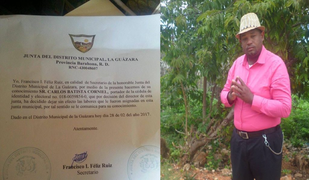 BARAHONA.- El destacado periodista Carlos Batista Corniel (El Guazarero), fue cancelado de la junta distrital de la Guazara donde laborara, lo que ha sido un golpe para dicho periodista.