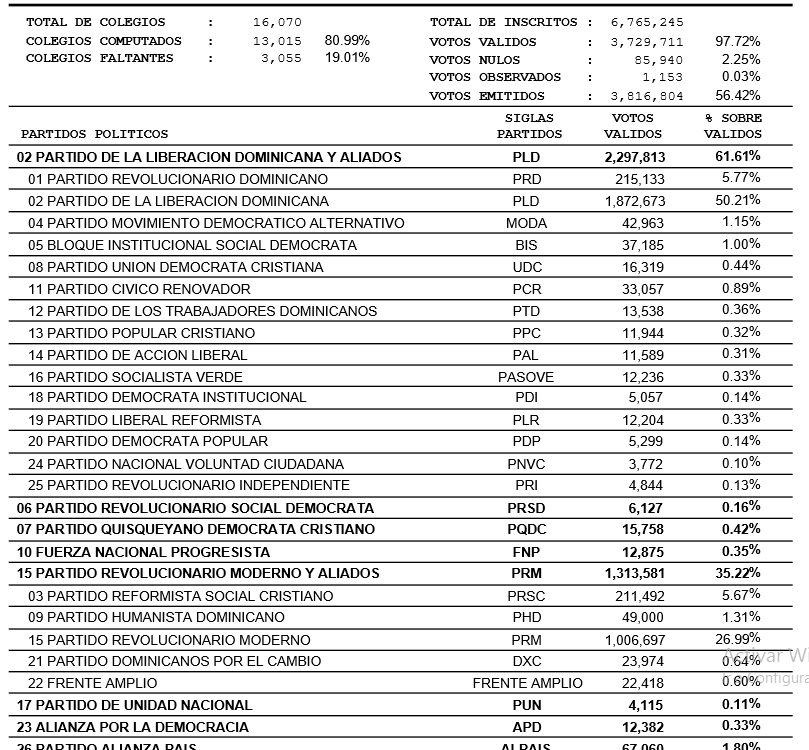 PARTIDO DE LA LIBERACION DOMINICANA PLD 60.29 %49