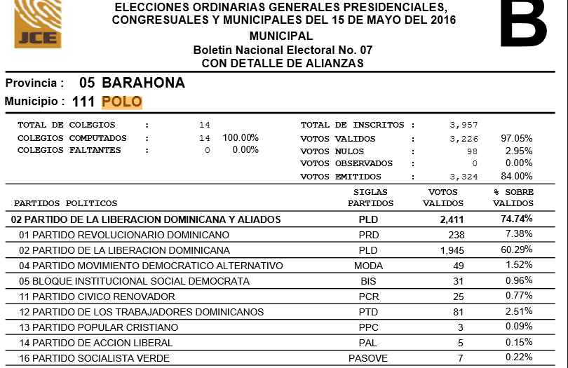 Deforma orientativa aquí los resultados de la JCE en el municipio de Polo,