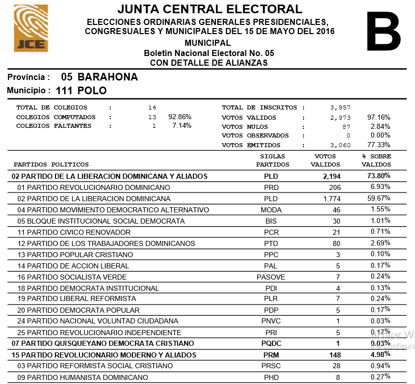Resultados computos JCE en Municipio de Polo