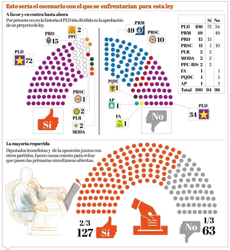En esta ocasión, por primera vez, el Partido de la Liberación Dominicana va con el bloque dividido para la aprobación de un proyecto, luego de que el Comité Político dejara libres a sus legisladores para que tomaran su decisión en torno al tema de las primarias, si abiertas o cerradas.
